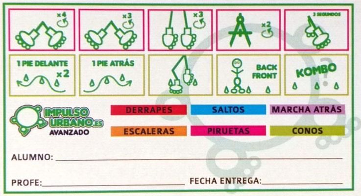 En cuanto entras a nuestras clases de Patinaje Urbano o Freestyle Slalom, tu profesor te dará la tarjeta de examen correspondiente. Poco a poco, sin prisas y a tu ritmo, iras completando cada desafío, mejorando tu técnica y convirtiéndote en un mejor patinador.